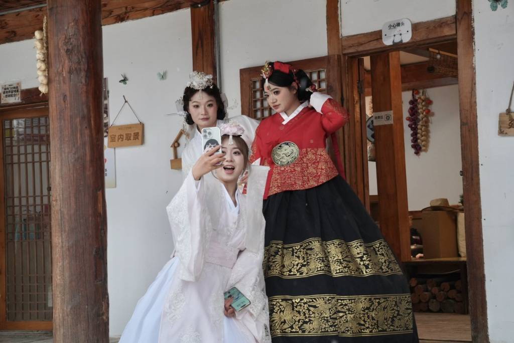 11月27日,3名旅客正在延吉市中国朝鲜族风俗园体验朝鲜族保守服饰。 磅礴旧事记者 王洛伊 图。