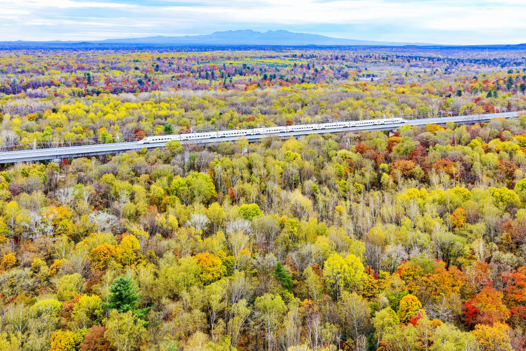 沈白高铁于2025年国庆前夜开通,将通化、白山融入沈阳一小时都会圈。图为沈白高铁一列列车驶过白山市抚松县的秋季林海。 视觉中国 图。